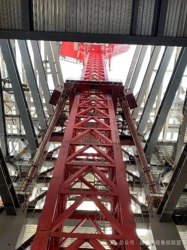 3、發(fā)明了“一種六支座下承支撐式塔吊支撐體系”“附著面收縮情況下動臂塔吊爬升輔助結構”和“適應于塔吊附著面收縮狀態(tài)的塔吊支撐架”,形成了巨柱外掛式大型塔吊自爬支撐設計與應用技術。